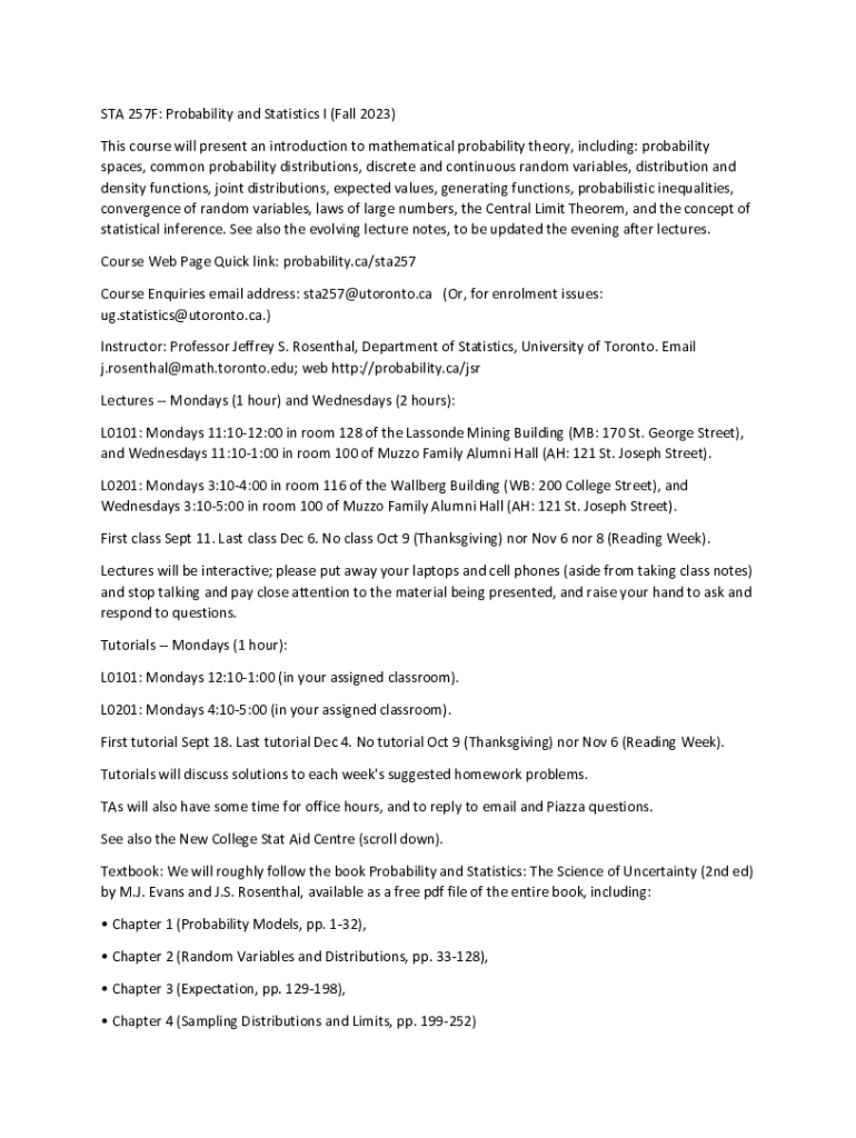 STA 257F: Probability and Statistics I (Fall 2023) This course will present an introduction to mathematical probability theory, including: probability spaces, common probability distributions, discrete