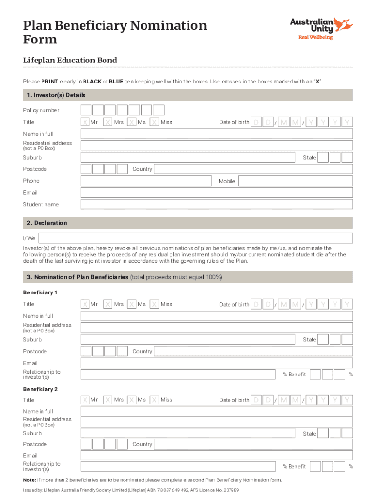 Plan Beneficiary Nomination Form Lifeplan Education Bond Please PRINT clearly in BLACK or BLUE pen keeping well within the boxes. Use crosses in the boxes marked with an X.1. Investor(s) Details Policy