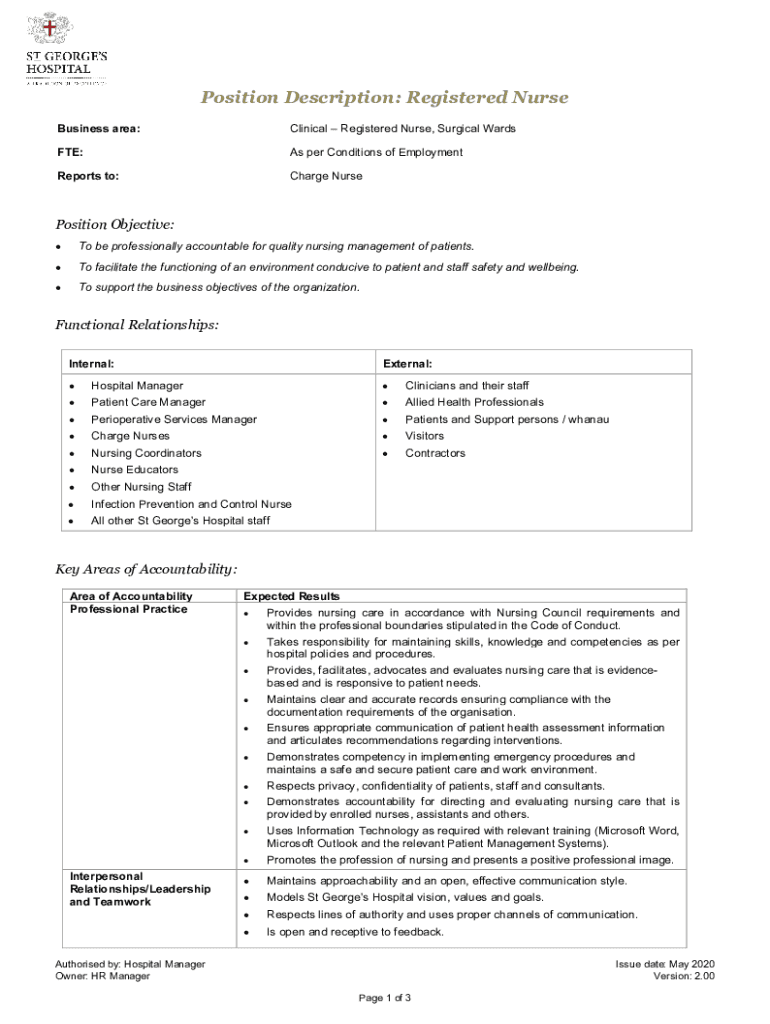 Position Description: Registered Nurse Business area:Clinical Registered Nurse, Surgical WardsFTE:As per Conditions of EmploymentReports to:Charge NursePosition Objective: To be professionally accountable