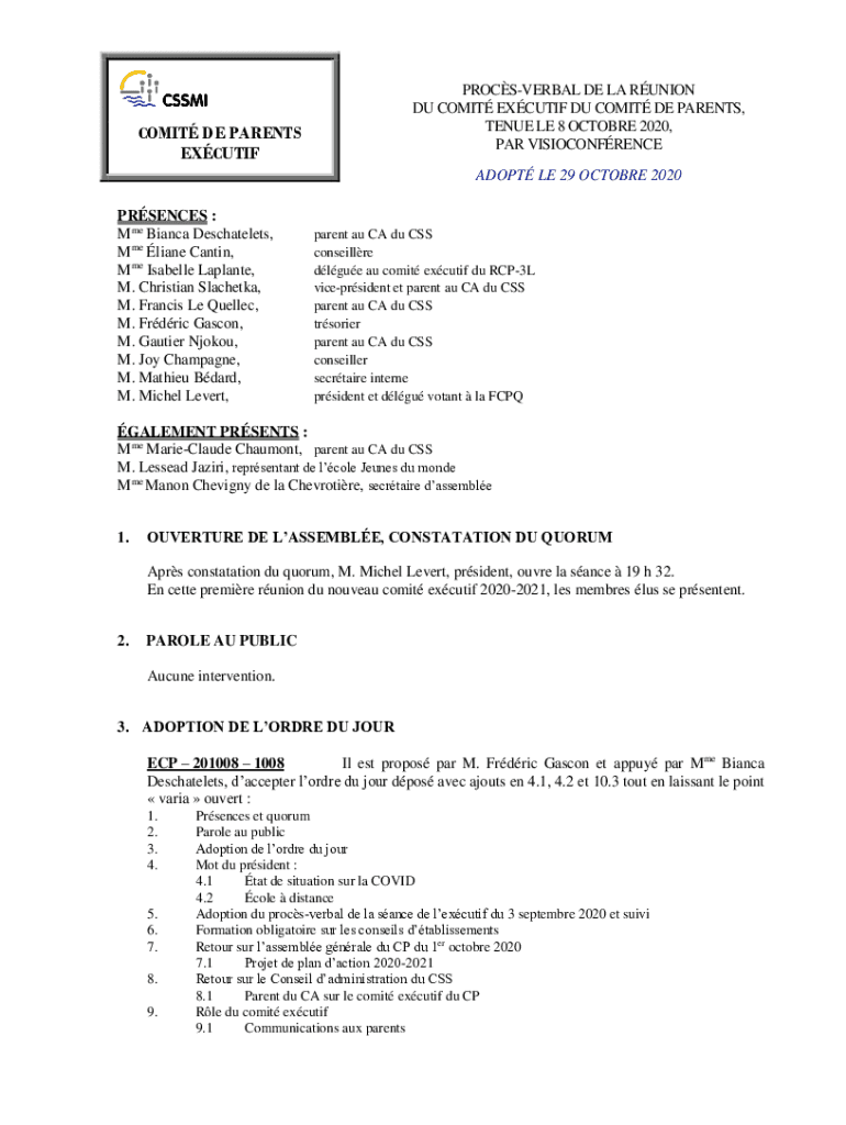 PROCSVERBAL DE LA RUNION DU COMIT EXCUTIF DU COMIT DE PARENTS, TENUE LE 8 OCTOBRE 2020, PAR VISIOCONFRENCECOMIT DE PARENTS EXCUTIFADOPT LE 29 OCTOBRE 2020 PRSENCES : Mme Bianca Deschatelets, Mme liane