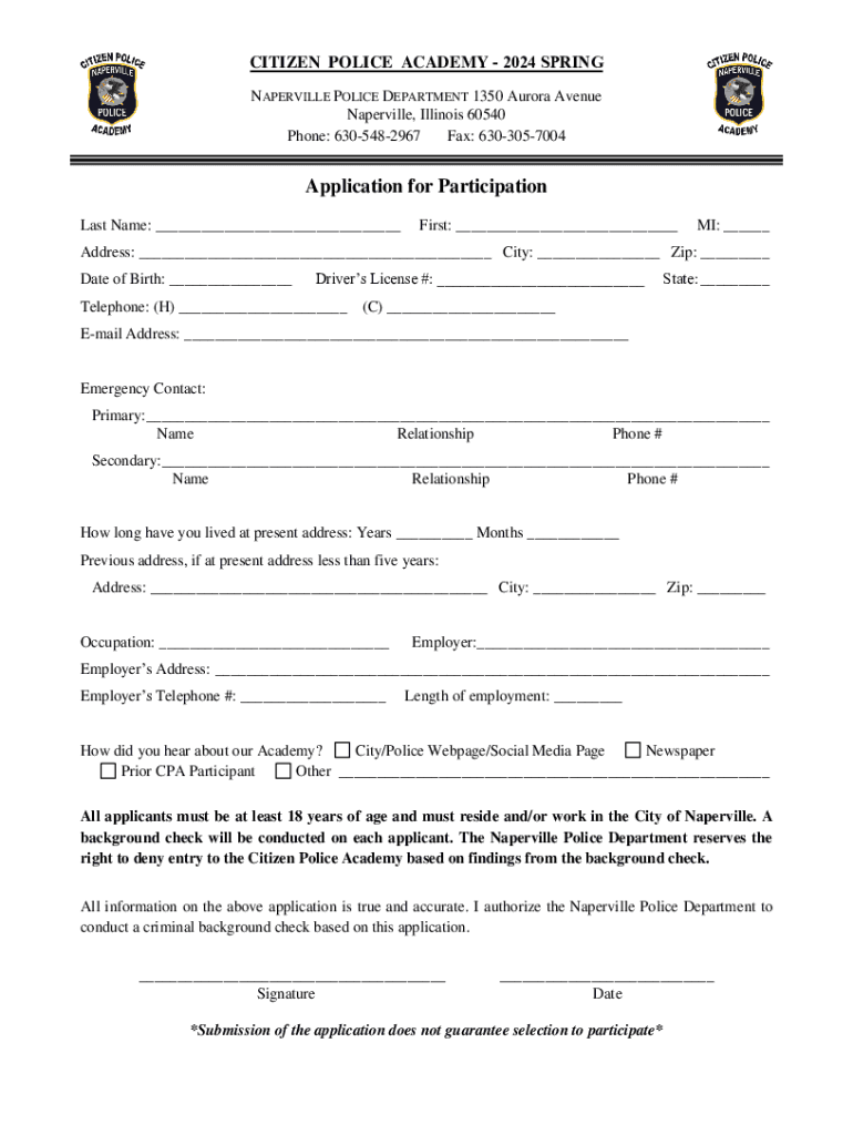 CITIZEN POLICE ACADEMY 2024 SPRING NAPERVILLE POLICE DEPARTMENT 1350 Aurora Avenue Naperville, Illinois 60540 Phone: 6305482967 Fax: 6303057004Application for Participation Last Name: ___First: ___MI: