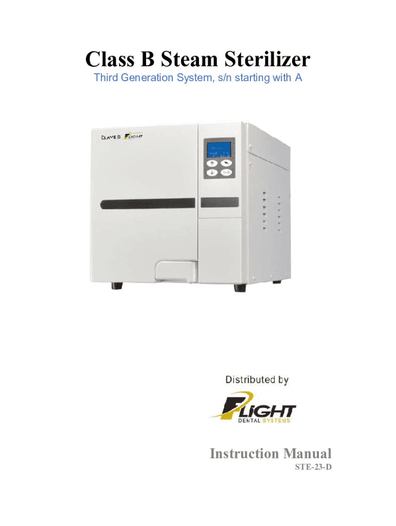 Class B Steam Sterilizer Third Generation System, s/n starting with AInstruction Manual STE23DThank you for choosing our steam sterilizer. Prior to operating this instrument, please read the instruction