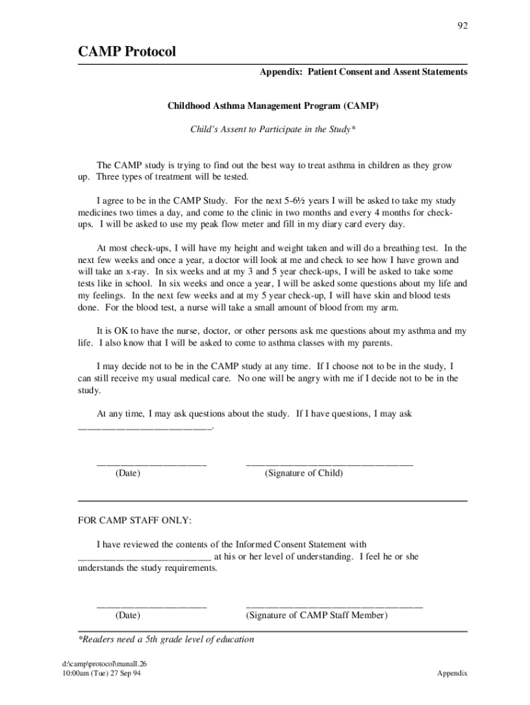 92CAMP Protocol Appendix: Patient Consent and Assent Statements Childhood Asthma Management Program (CAMP) Child\'s Assent to Participate in the Study* The CAMP study is trying to find out the best
