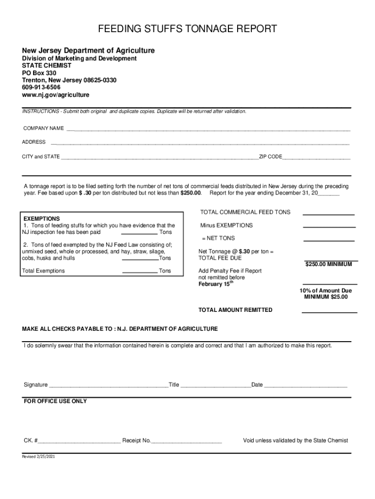 FEEDING STUFFS TONNAGE REPORT New Jersey Department of Agriculture Division of Marketing and Development STATE CHEMIST PO Box 330 Trenton, New Jersey 086250330 6099136506 www.nj.gov/agriculture___