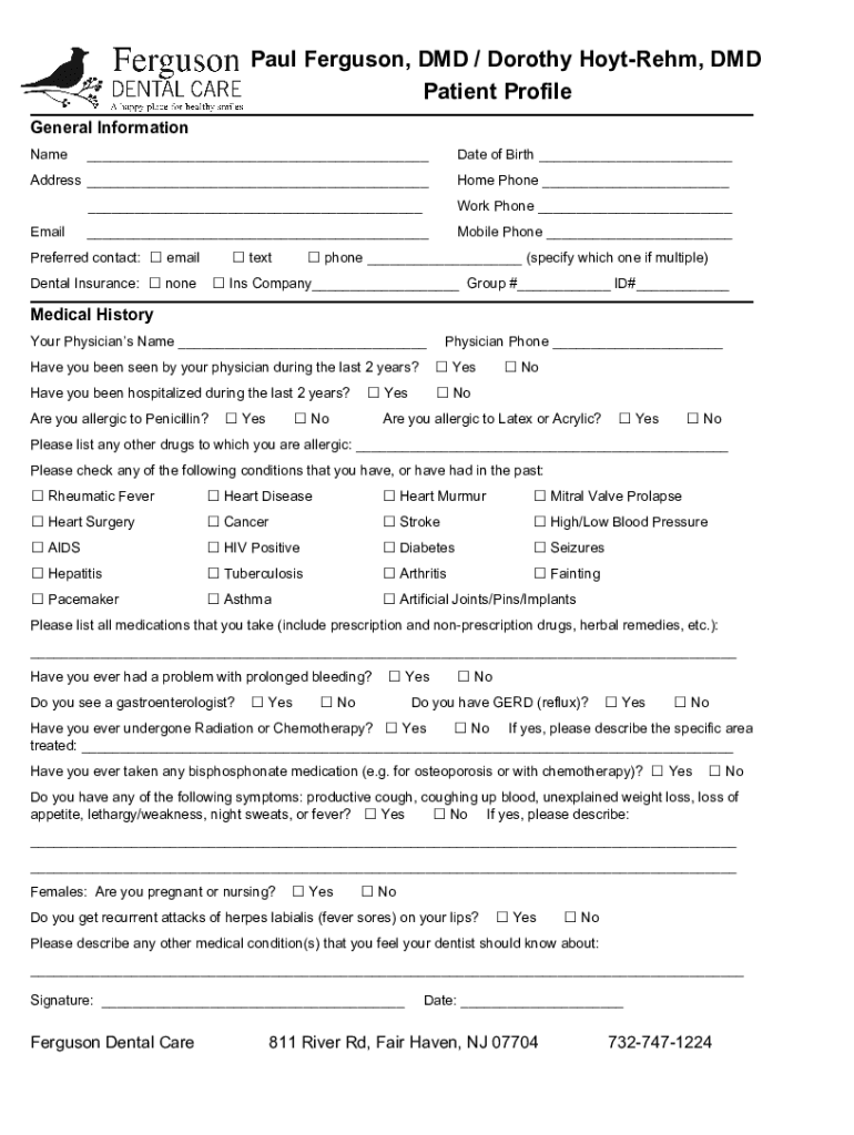 Paul Ferguson, DMD / Dorothy HoytRehm, DMD Patient Profile General Information Name___Date of Birth ___Address ___Home Phone ___Email___Work Phone ______Mobile Phone ___Preferred contact: email textDental