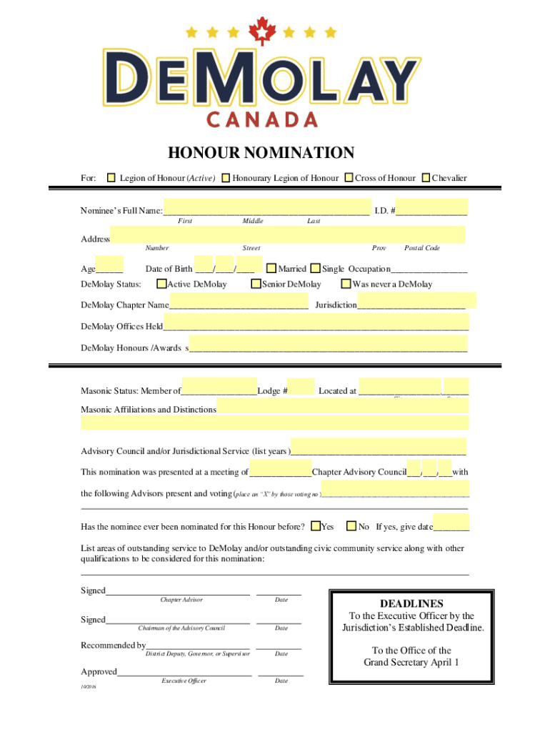 HONOUR NOMINATION For: Legion of Honour (Active) Honourary Legion of Honour Cross of Honour ChevalierNominees Full Name: ___ I.D. #___ FirstMiddleLastAddress___ NumberStreetDate of Birth ___/___/___Age