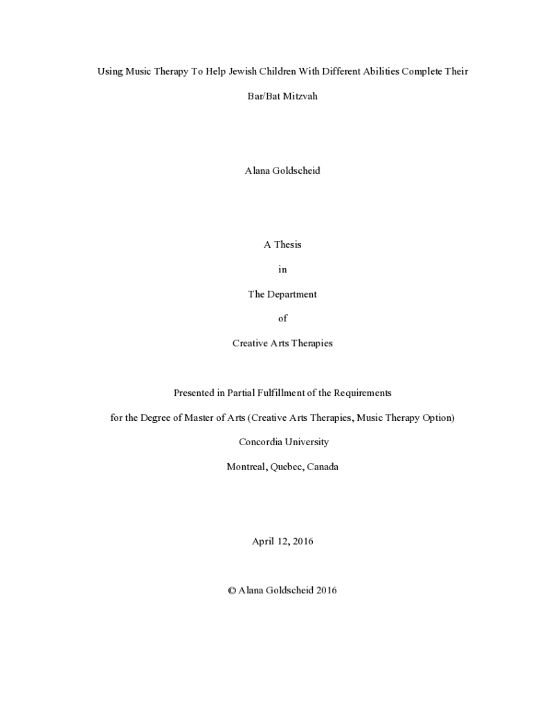 Using Music Therapy To Help Jewish Children With Different Abilities Complete Their Bar/Bat MitzvahAlana GoldscheidA Thesis in The Department of Creative Arts TherapiesPresented in Partial Fulfillment