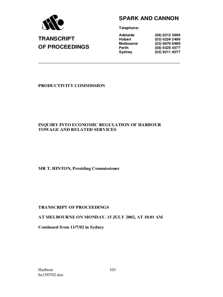 SPARK AND CANNON Telephone: Adelaide Hobart Melbourne Perth SydneyTRANSCRIPT OF PROCEEDINGS(08) 8212 3699 (03) 6224 2499 (03) 9670 6989 (08) 9325 4577 (02) 9211 4077___PRODUCTIVITY COMMISSIONINQUIRY