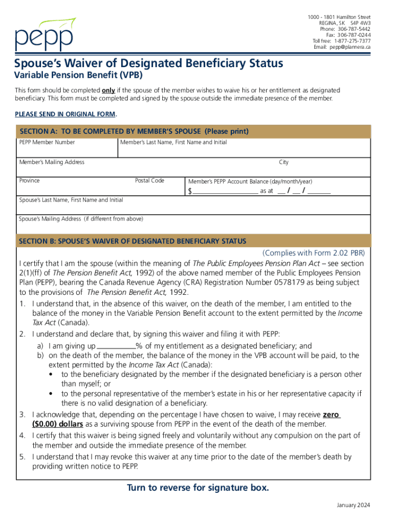 1000 1801 Hamilton Street REGINA, SK S4P 4W3 Phone: 3067875442 Fax: 3067870244 Toll free: 18772757377 Email: pepp@plannera.caSpouses Waiver of Designated Beneficiary StatusReset FormVariable Pension