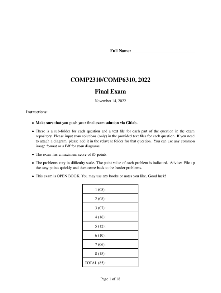 Full Name:COMP2310/COMP6310, 2022 Final Exam November 14, 2022 Instructions: Make sure that you push your final exam solution via Gitlab. There is a subfolder for each question and a text file for