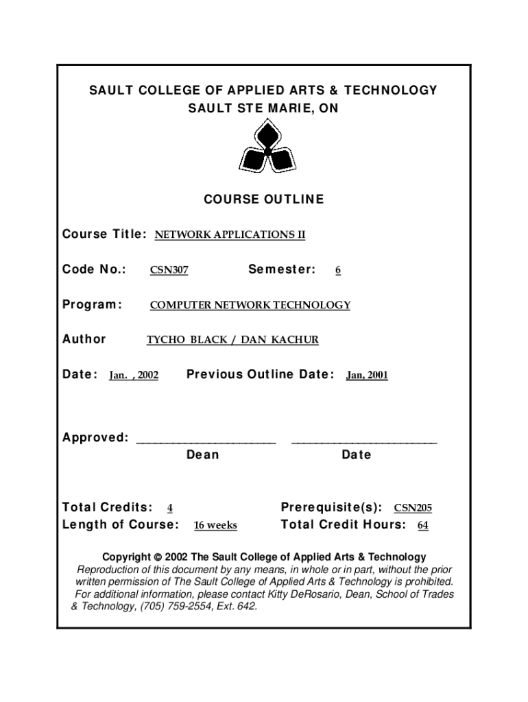 SAULT COLLEGE OF APPLIED ARTS & TECHNOLOGY SAULT STE MARIE, ONCOURSE OUTLINE Course Title: NETWORK APPLICATIONS II Code No.:CSN307Program:COMPUTER NETWORK TECHNOLOGYAuthor Date:Semester:6TYCHO BLACK
