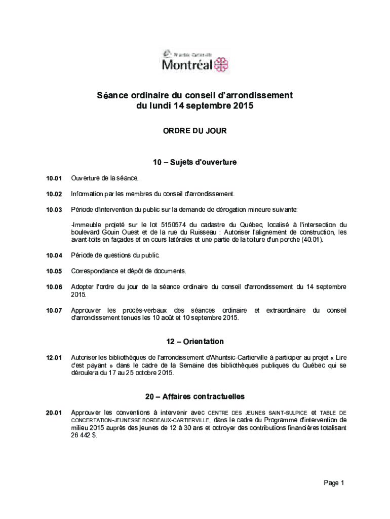 Sance ordinaire du conseil darrondissement du lundi 14 septembre 2015 ORDRE DU JOUR10 Sujets d\'ouverture 10.01Ouverture de la sance.10.02Information par les membres du conseil d\'arrondissement.10.03Priode