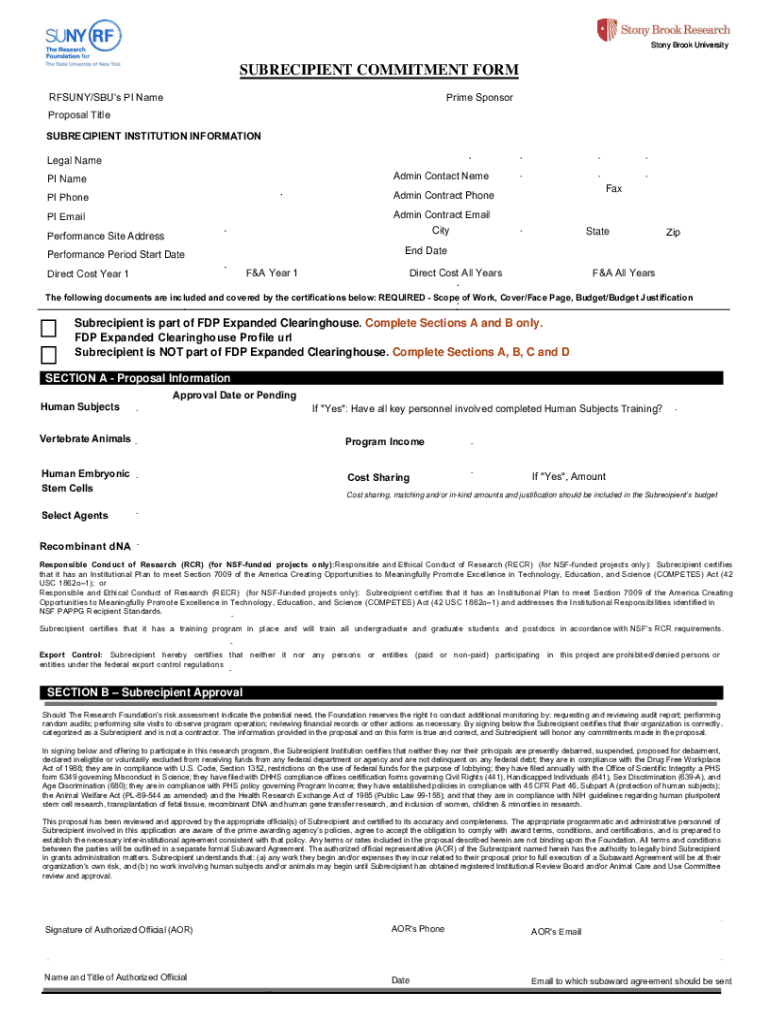 Ston tony B Brrook Un Uniive verrsitySUBRECIPIENT COMMITMENT FORM Prime SponsorRFSUNY/SBUs PI Name Proposal Title SUBRECIPIENT INSTITUTION INFORMATION Legal Name PI NameAdmin Contact NamePI PhoneAdmin