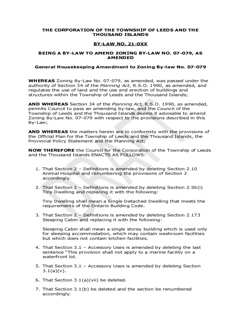 THE CORPORATION OF THE TOWNSHIP OF LEEDS AND THE THOUSAND ISLANDS BYLAW NO. 210XX BEING A BYLAW TO AMEND ZONING BYLAW NO. 07079, AS AMENDED General Housekeeping Amendment to Zoning Bylaw No. 07079