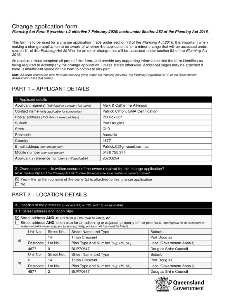 Change application form Planning Act Form 5 (version 1.2 effective 7 February 2020) made under Section 282 of the Planning Act 2016. This form is to be used for a change application made under section