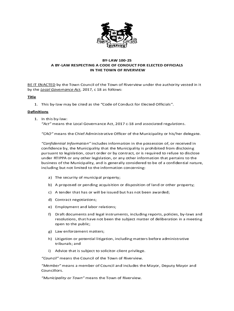 BYLAW 10025 A BYLAW RESPECTING A CODE OF CONDUCT FOR ELECTED OFFICIALS IN THE TOWN OF RIVERVIEW IT ENACTED by the Town Council of the Town of Riverview under the authority vested in it by the Local