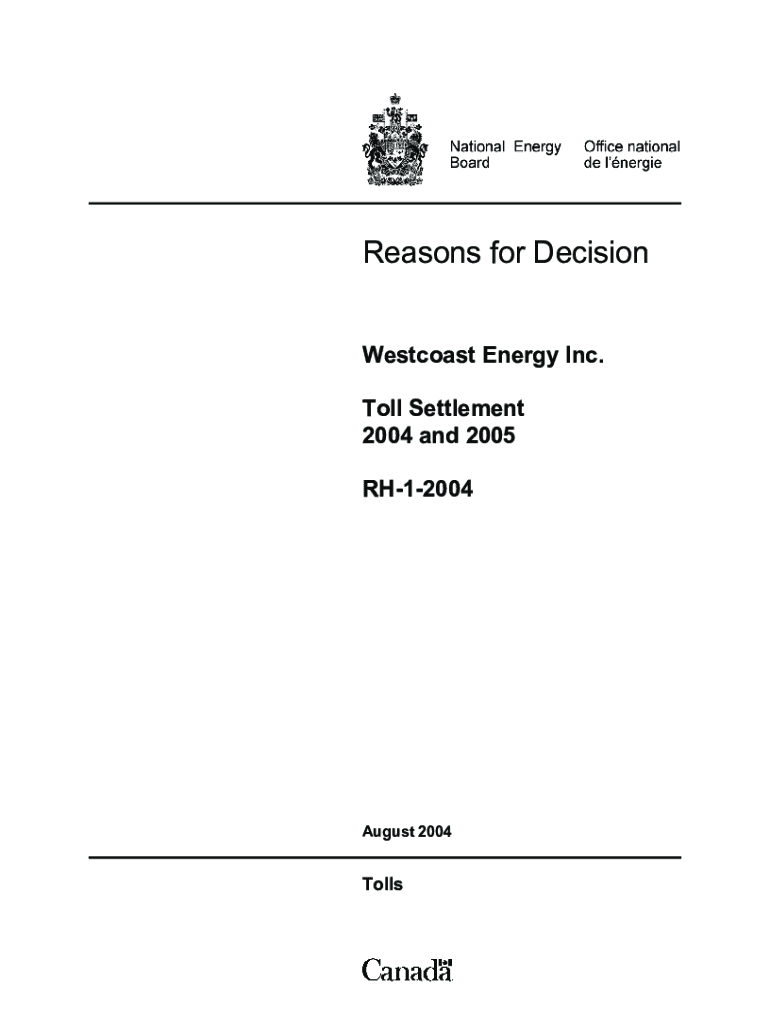 Reasons for Decision Westcoast Energy Inc. Toll Settlement 2004 and 2005 RH12004August 2004TollsNational Energy BoardReasons for Decision In the Matter ofWestcoast Energy Inc. Toll Settlement 2004