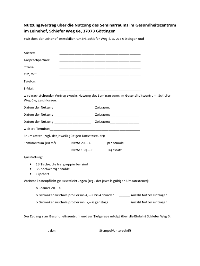 Nutzungsvertrag ber die Nutzung des Seminarraums im Gesundheitszentrum im Leinehof, Schiefer Weg 6e, 37073 Gttingen Zwischen der Leinehof Immobilien GmbH, Schiefer Weg 4, 37073 Gttingen undMieter:___Ansprechpartner:___Strae:___PLZ,
