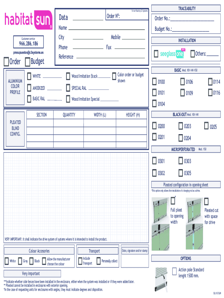 Order N:DataOrder No.:___NameINSTALLATIONFaxNEW!Others:ReferenceBudgetALUMINIUM COLOR PROFILEMobilePhonepresupuestos@c3systems.esOrderBudget No.:___CityCustomer service966.286.186TRACEABILITYTo be