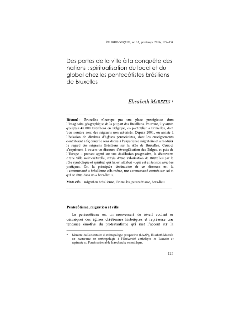 RELIGIOLOGIQUES, no 33, printemps 2016, 125154Des portes de la ville la conqute des nations : spiritualisation du local et du global chez les pentectistes brsiliens de Bruxelles Elisabeth MAREELS