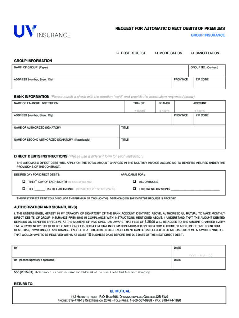 REQUEST FOR AUTOMATIC DIRECT DEBITS OF PREMIUMS GROUP INSURANCEFIRST REQUESTMODIFICATIONCANCELLATIONGROUP INFORMATION NAME OF GROUP (Payer)GROUP NO. (Contract)ADDRESS (Number, Street, City)PROVINCEZIP
