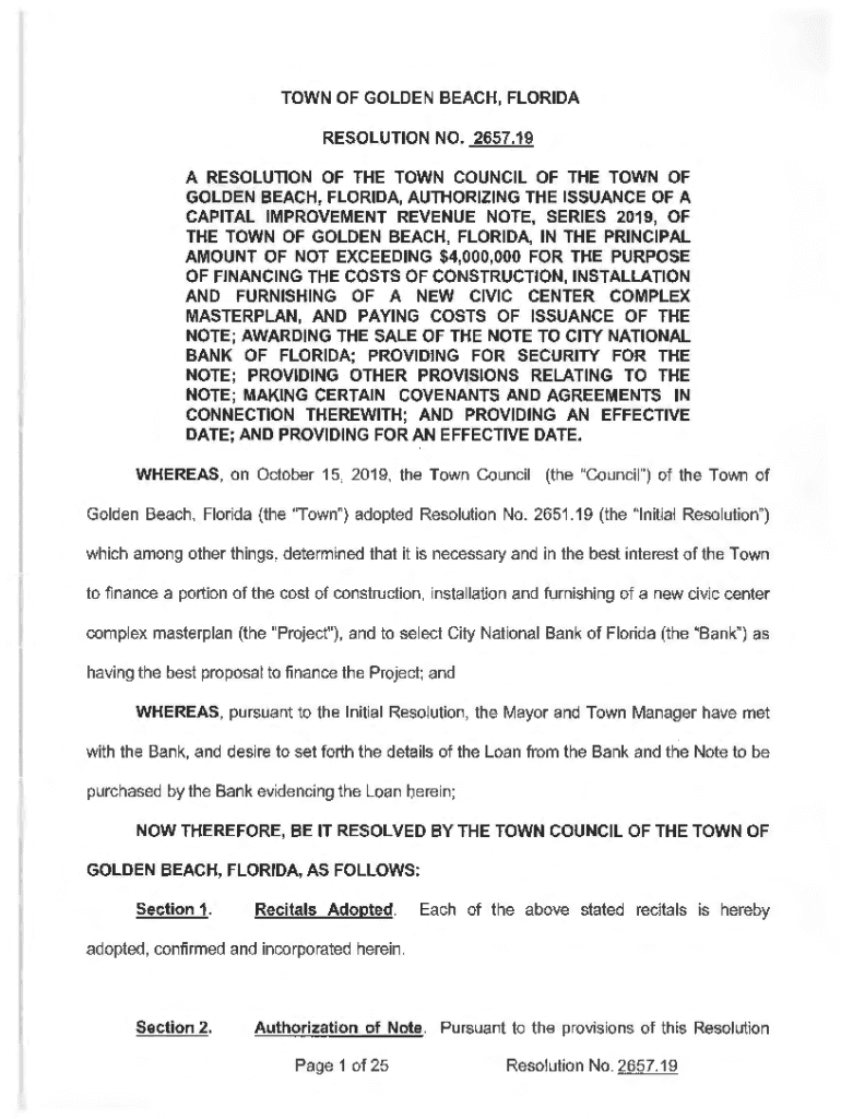 TOWN OF GOLDEN BEACH, FLORIDA RESOLUTION NO. 2657.19 A RESOLUTION OF THE TOWN COUNCIL OF THE TOWN OF GOLDEN BEACH, FLORIDA, AUTHORIZING THE ISSUANCE OF A CAPITAL IMPROVEMENT REVENUE NOTE, SERIES 2019,