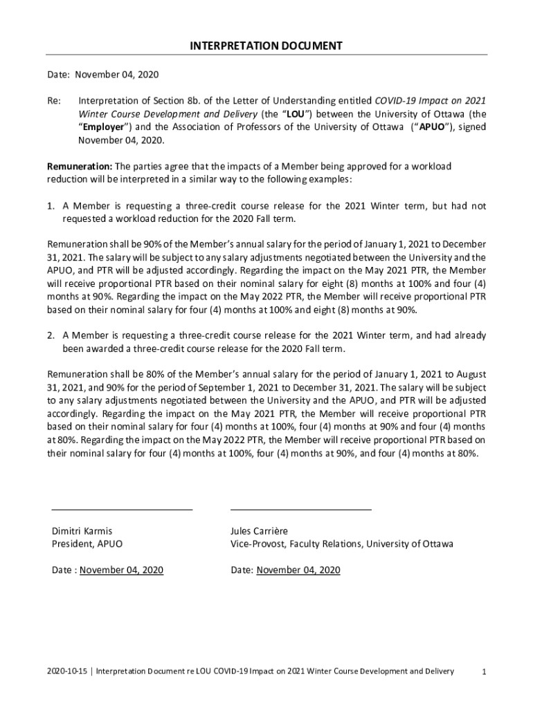 INTERPRETATION DOCUMENT Date: November 04, 2020 Re:Interpretation of Section 8b. of the Letter of Understanding entitled COVID19 Impact on 2021 Winter Course Development and Delivery (the LOU) between