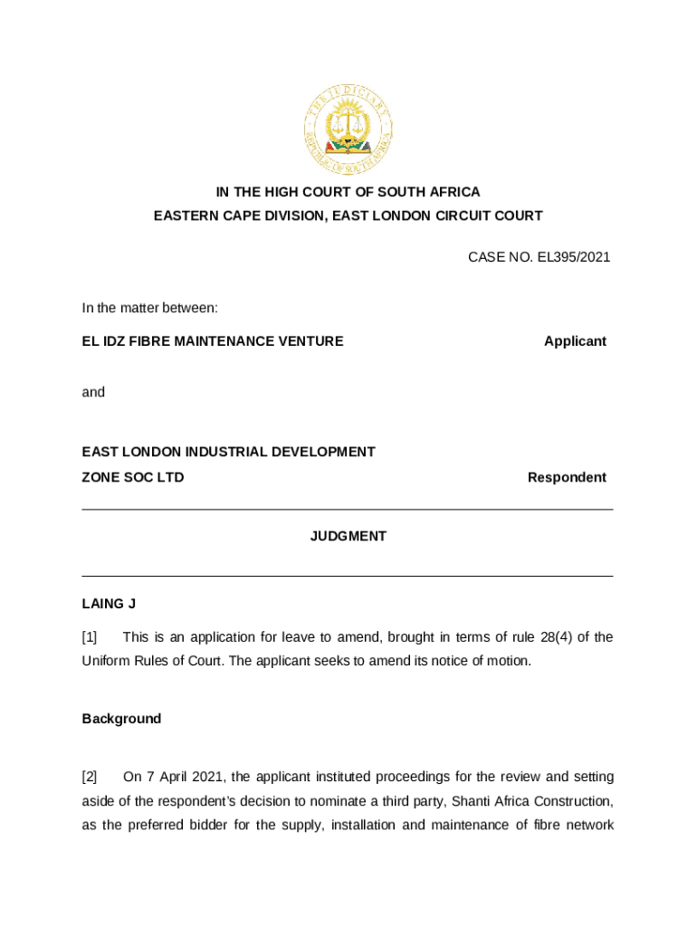EL ID Fiber MAINTENANCE VENTUREApplicantandEAST LONDON INDUSTRIAL DEVELOPMENT