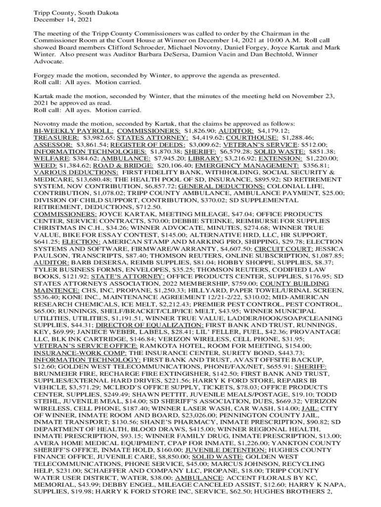 Tripp County, South Dakota December 14, 2021 The meeting of the Tripp County Commissioners was called to order by the Chairman in the Commissioner Room at the Court House at Winner on December 14,