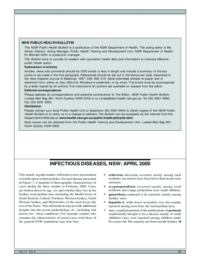 The NSW Public Health Bulletin is a publication of the NSW Department of Health. The acting editor is Ms
