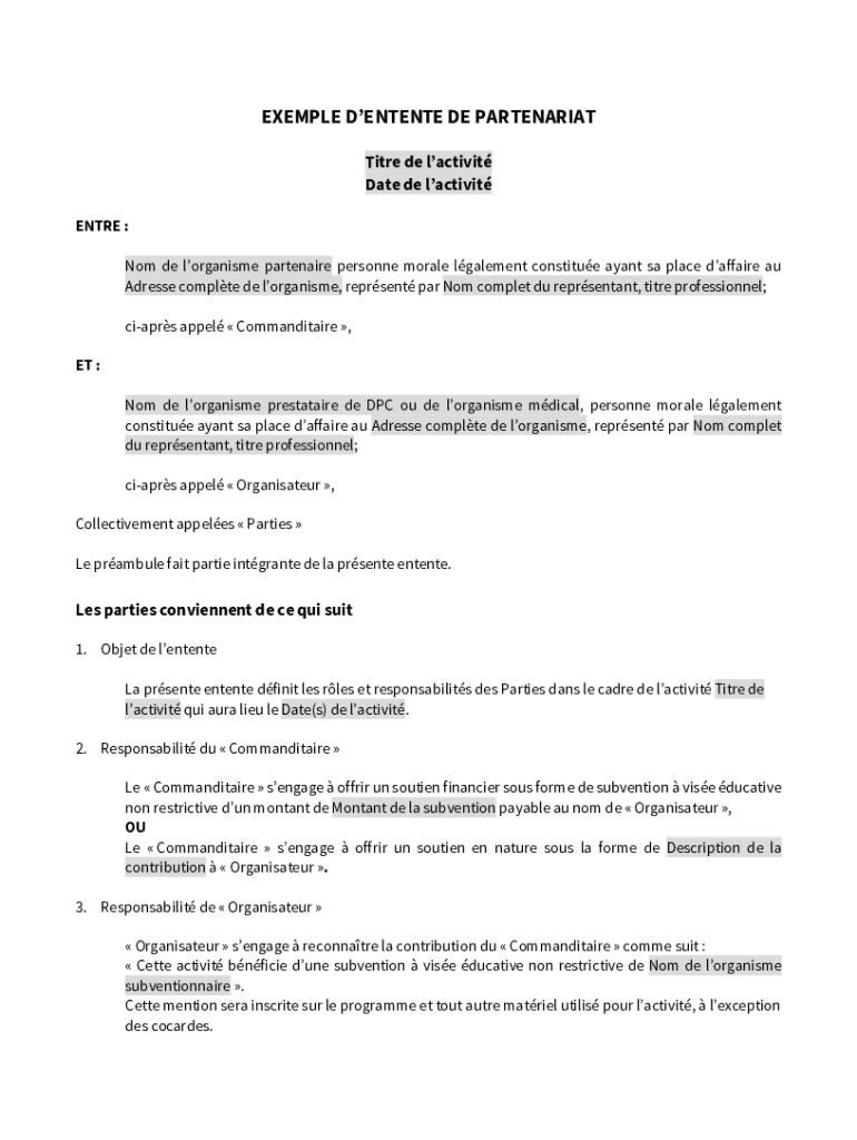 EXEMPLE DENTENTE DE PARTENARIAT Titre de lactivit Date de lactivit ENTRE : Nom de lorganisme partenaire personne morale lgalement constitue ayant sa place daffaire au Adresse complte de lorganisme,