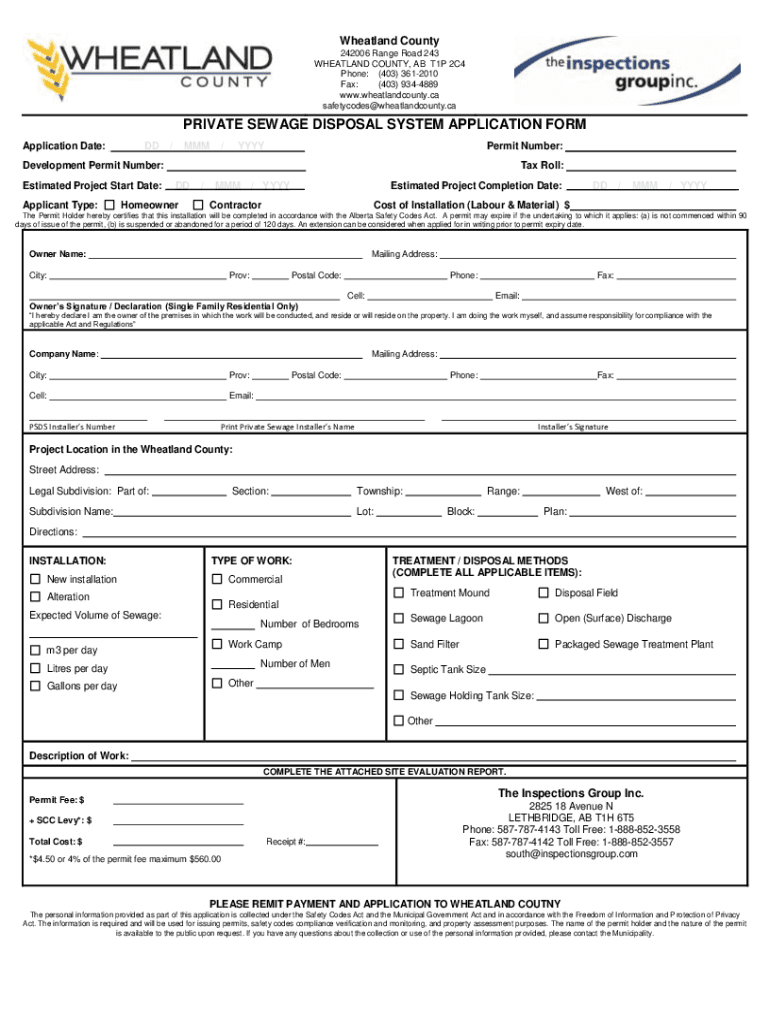 safetycodes@wheatlandcounty.caPRIVATE SEWAGE DISPOSAL SYSTEM APPLICATION