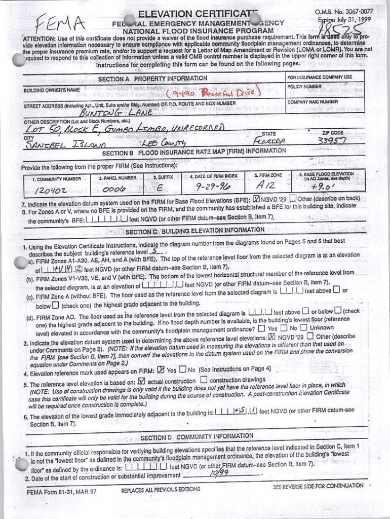 O. M. B. No. 3067 0077ELEVATION CERTIFICAT\'FELSALNATIONAL FLOOD INSURANCE UseATTENTION:thisofdoes notcertificateaprovide9PROGRAMflood insuranceof thewaiver7Pite5JdY3l.aENCYMANAGEMENZEMERGENCYrequirement.purchaseThis