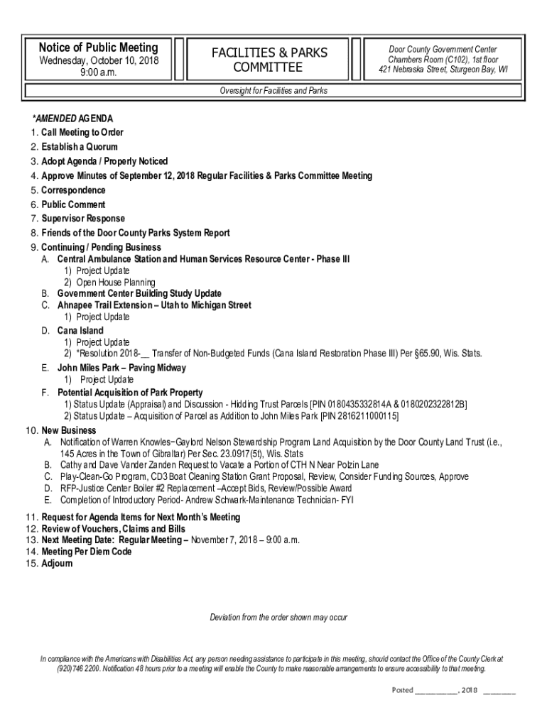 Notice of Public MeetingWednesday, October 10, 2018 9:00 a.m.FACILITIES & PARKS COMMITTEEDoor County Government Center Chambers Room (C102), 1st floor 421 Nebraska Street, Sturgeon Bay, WIOversight