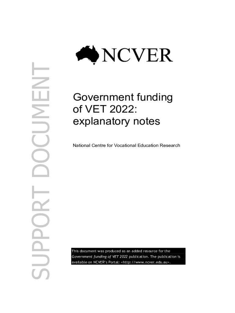 SUPPORT DOCUMENTGovernment funding of VET 2022: explanatory notes National Centre for Vocational Education ResearchThis document was produced as an added resource for the Government funding of VET