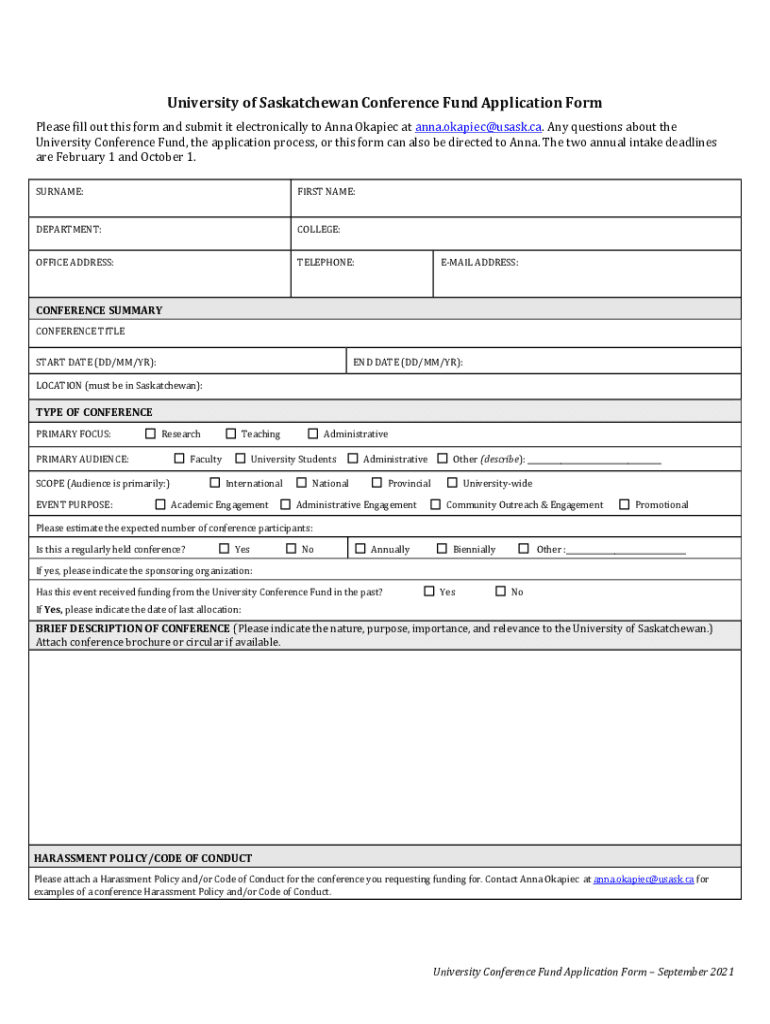 University of Saskatchewan Conference Fund Application Form Please fill out this form and submit it electronically to Anna Okapiec at anna.okapiec@usask.ca. Any questions about the University Conference
