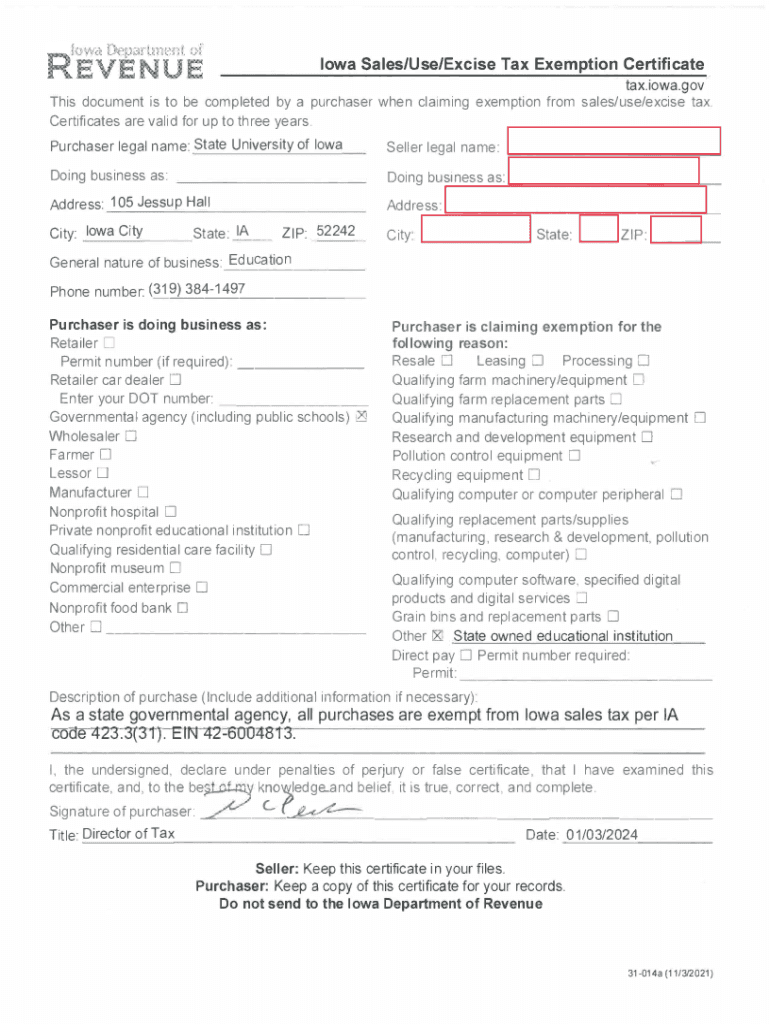 Iowa Sales/Use/Excise Tax Exemption Certificate tax.iowa.gov This document is to be completed by a purchaser when claiming exemption from sales/use/excise tax. Certificates are valid for up to three