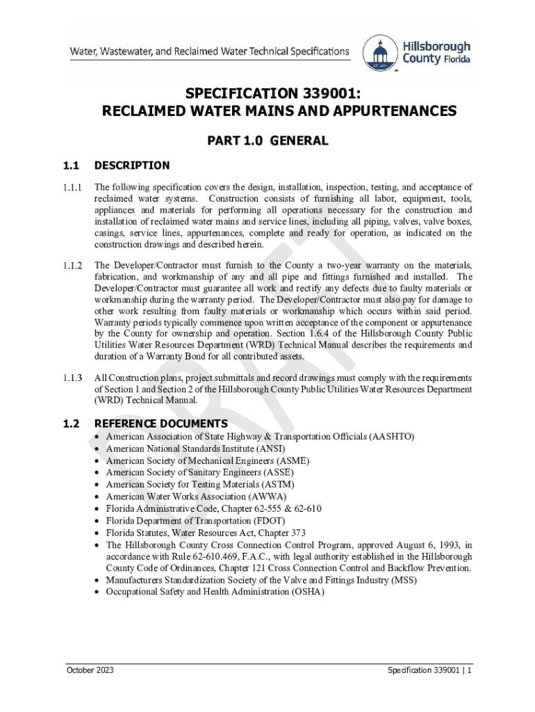 SPECIFICATION 339001: RECLAIMED WATER MAINS AND APPURTENANCES PART 1.0 GENERAL 1.1DESCRIPTION The following specification covers the design, installation, inspection, testing, and acceptance of reclaimed