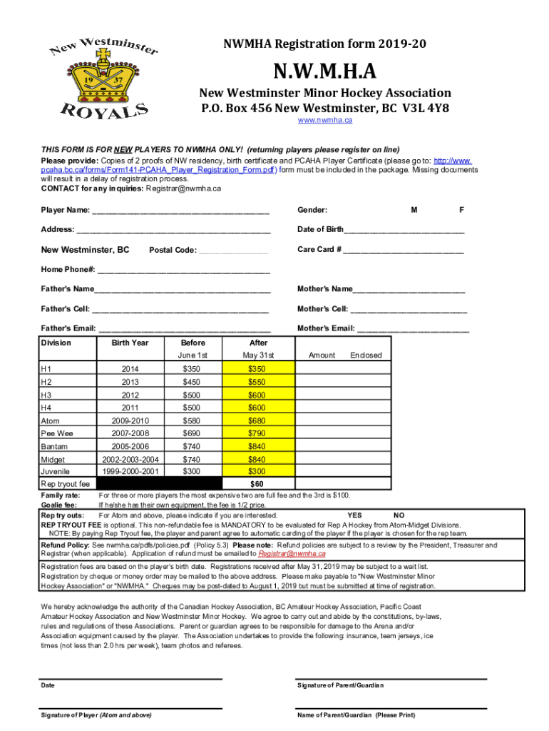 NWMHA Registration form 201920N.W.M.H.A New Westminster Minor Hockey Association P.O. Box 456 New Westminster, BC V3L 4Y8 www.nwmha.caTHIS FORM IS FOR NEW PLAYERS TO NWMHA ONLY! (returning players