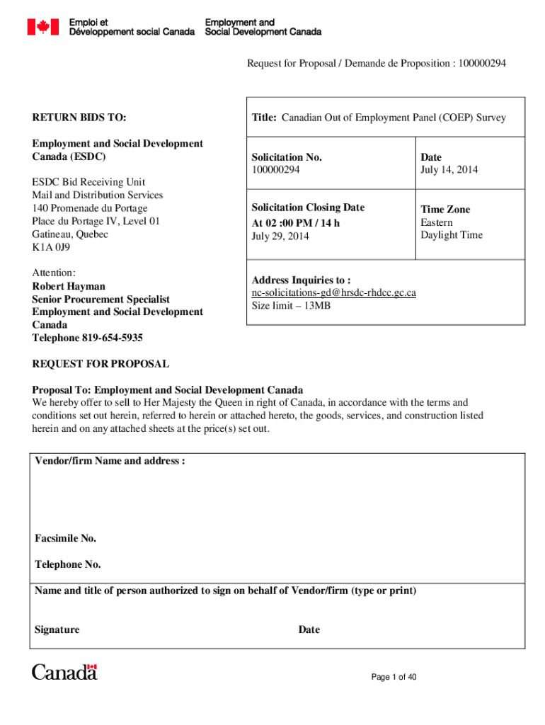 Request for Proposal / Demande de Proposition : 100000294RETURN BIDS TO: Employment and Social Development Canada (ESDC) ESDC Bid Receiving Unit Mail and Distribution Services 140 Promenade du Portage