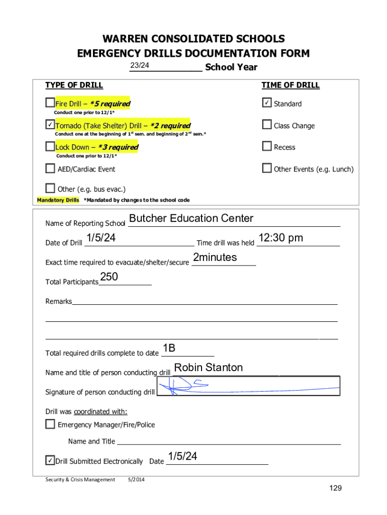 WARREN CONSOLIDATED SCHOOLS EMERGENCY DRILLS DOCUMENTATION FORM 23/24 ___ School YearTYPE OF DRILLTIME OF DRILLFire Drill *5 required StandardConduct one prior to 12/1* Tornado (Take Shelter) Drill