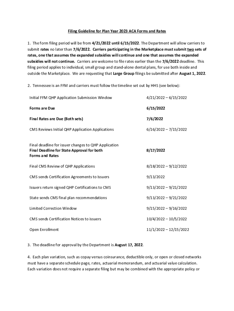 Filing Guideline for Plan Year 2023 ACA Forms and Rates 1. The form filing period will be from 4/21/2022 until 6/15/2022. The Department will allow carriers to submit rates no later than 7/6/2022.