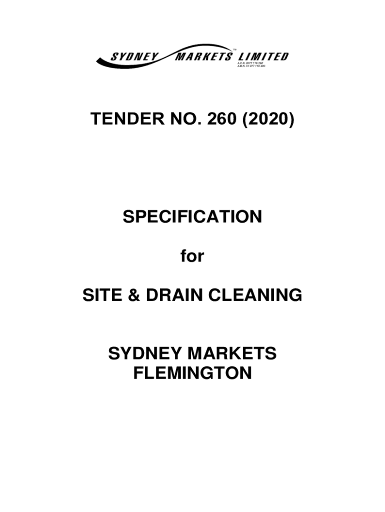 TENDER NO. 260 (2020)SPECIFICATION for SITE & DRAIN CLEANINGSYDNEY MARKETS FLEMINGTONINSTRUCTIONS TENDERERS MUST READ AND COMPLY WITH THE FOLLOWING INSTRUCTIONS:1. All tenderers are required to physically