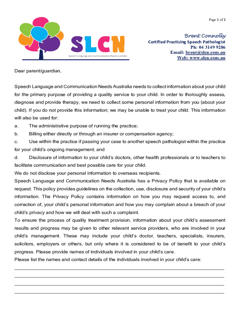 Page 1 of 2Brent Connolly Certified Practising Speech Pathologist Ph: 04 3149 9286 Email: brent@slcn.com.au Web: www.slcn.com.au Dear parent/guardian, Speech Language and Communication Needs Australia