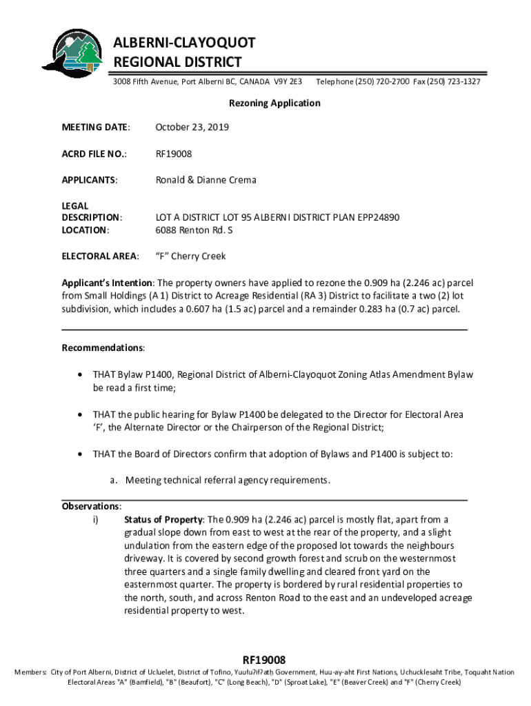 ALBERNICLAYOQUOT REGIONAL DISTRICT 3008 Fifth Avenue, Port Alberni BC, CANADA V9Y 2E3Telephone (250) 7202700 Fax (250) 7231327Rezoning Application MEETING DATE:October 23, 2019ACRD FILE NO.:RF19008APPLICANTS:Ronald