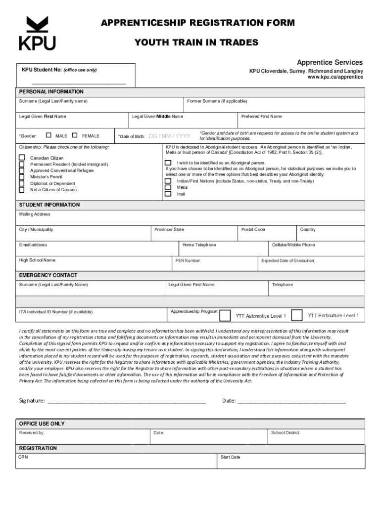 APPRENTICESHIP REGISTRATION FORM YOUTH TRAIN IN TRADES Apprentice Services KPU Student No: (office use only)KPU Cloverdale, Surrey, Richmond and Langley www.kpu.ca/apprentice___ PERSONAL INFORMATION