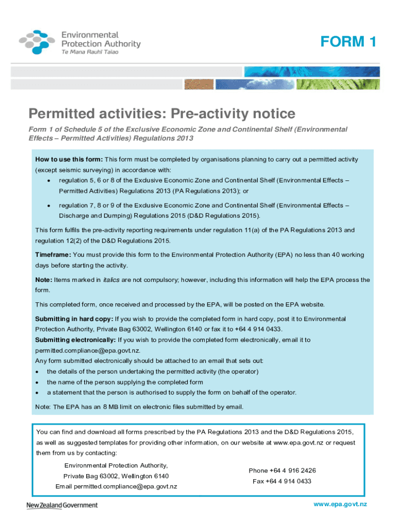 FORM 1Permitted activities: Preactivity notice Form 1 of Schedule 5 of the Exclusive Economic Zone and Continental Shelf (Environmental Effects Permitted Activities) Regulations 2013 How to use this
