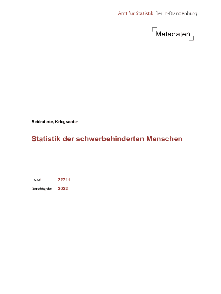 MetadatenBehinderte, KriegsopferStatistik der schwerbehinderten MenschenEVAS:22711Berichtsjahr:2023Inhaltsverzeichnis A Erluterungen B Qualittsbericht C Erhebungsbogen D DatensatzbeschreibungImpressum