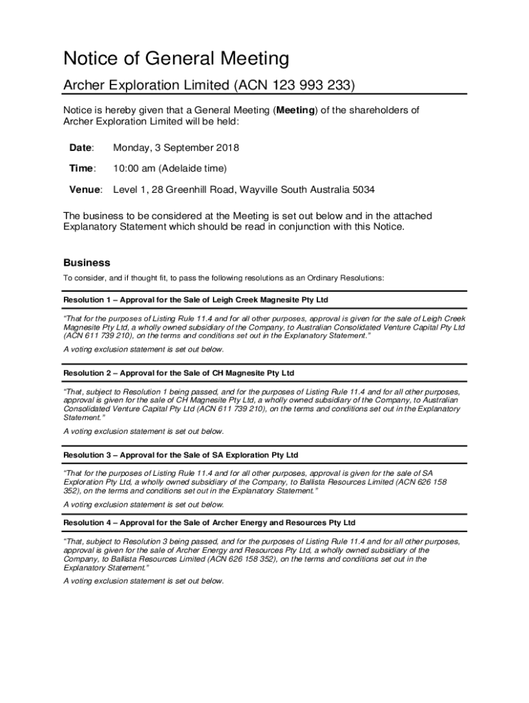 Notice of General Meeting Archer Exploration Limited (ACN 123 993 233) Notice is hereby given that a General Meeting (Meeting) of the shareholders of Archer Exploration Limited will be held: Date:Monday,