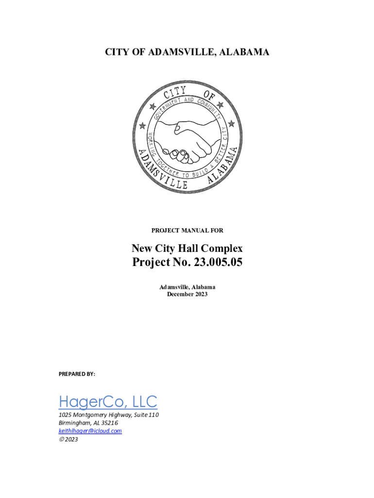 CITY OF ADAMSVILLE, ALABAMAPROJECT MANUAL FORNew City Hall ComplexProject No. 23.005.05 Adamsville, Alabama December 2023PREPARED BY:HagerCo, LLC1025 Montgomery Highway, Suite 110 Birmingham, AL 35216